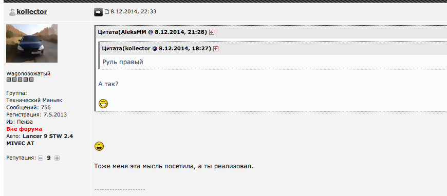 Wagonовожатый ![]() ![]() ![]() ![]() ![]() ![]() ![]() Группа: Технический Маньяк Сообщений: 1500 Регистрация: 7.5.2013 Из: Пенза Вне форума Авто: Lancer 9 STW 2.4 MIVEC AT Репутация: 21