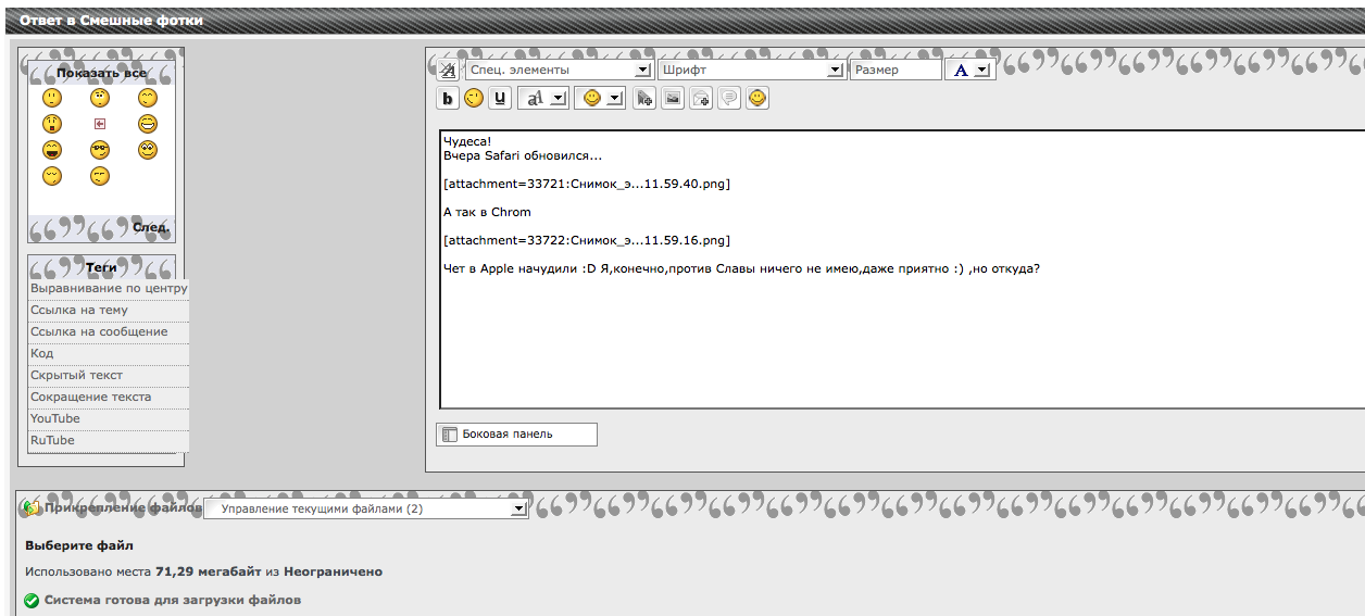 Вчера Safari обновился... А так в Chrom Чет в Apple начудили (IMG:style_emoticons/default/biggrin.gif) Я,конечно,против Славы ничего не имею,даже приятно (IMG:style_emoticons/default/smile.gif) ,но откуда? А так выглядит редактор... |