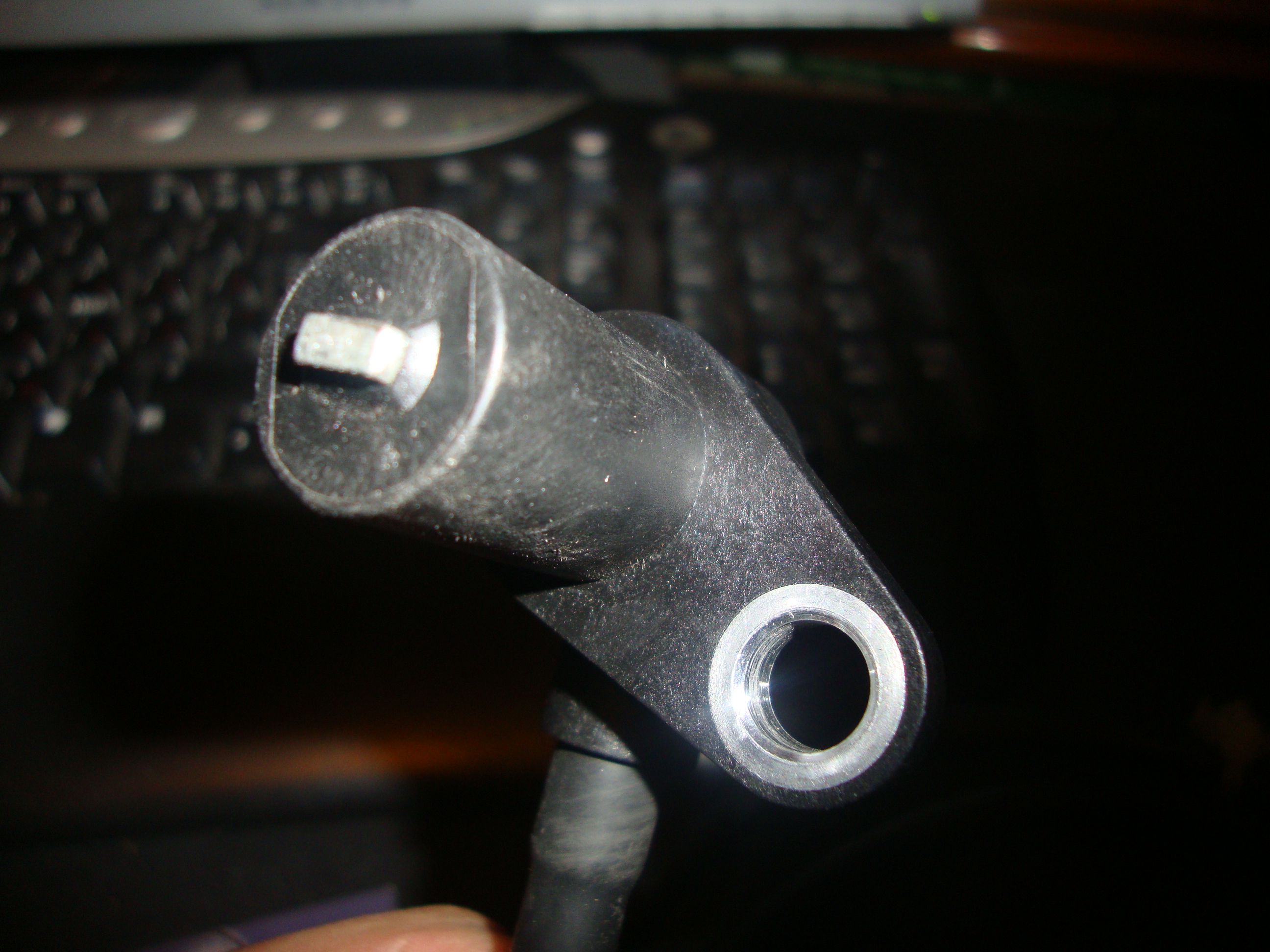 При установке любого неоригинального датчика советую промерить длину. Я промерял хвостовиком штангенциркуля, разница 0,5-0,7мм. Датчик менял без демонтажа кулака. Сколол верхнюю часть, затем убрал всю лишнюю пластмассу, нагрев феном (макс. режим). Удаляем магнит. Стержень имеет форму болта. Метал мягкий. Шляпку срезаем толстым сверлом, далее сверлом 5мм работаем вокруг стержня, как фрезой. По времени около получаса на демонтаж. |