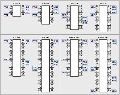 Как видно - 8, 14 и 20-ножечные МК совпадают даже по расположениям выводов, 18-ножечные имеют свое собственное расположение, 28-ножечные совпадают с 40.