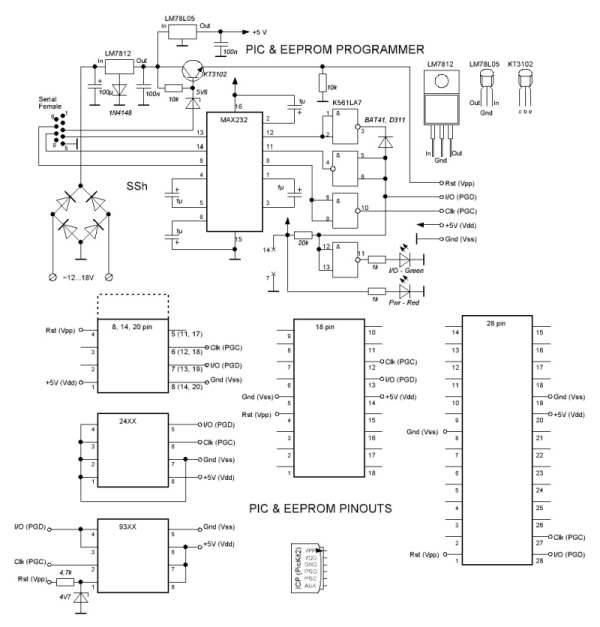 Вернемся к нашему программатору. Как уже отмечалось - собран по схеме JDM, поэтому будет работать с любым софтом, поддерживающим данный режим. Помимо pic-контроллеров им можно прошивать также EEPROM 24хх и 93хх серий. Схема программатора приведена ниже: