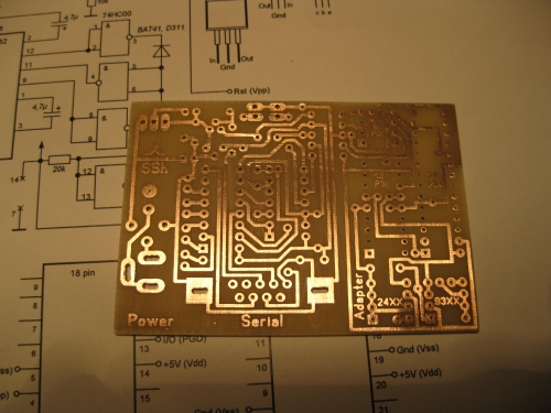 Ниже приведена переделанная схема и разводка. На разводке левая часть - собственно программатор, правая, совершенно автономная часть - адаптер под различные корпуса МК, ну и 24 и 93 память. Соединяются обе части небольшим 5-контактным шлейфом, вместо которого можно было бы установить перемычки, но, думаю, так лучше, чтоб при необходимости иметь возможность применения программатора в качестве внутрисхемного. На разводке адаптера отсутствуют панельки под 14 и 20 выводные корпуса. Такие микросхемы вставляются в 8-выводную панельку нижней частью (имеется в виду начиная с 1-го вывода), остальные выводы пусть висят в воздухе - они при прошивке не нужны.