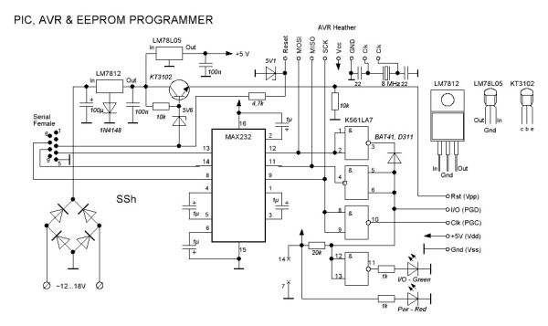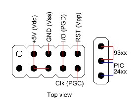 Т.е. имея базовый блок с соотв. выходами можно впоследствии подсоединять к ним нужные выводы МК и программировать его. Кстати те же сигналы используются и для прошивки некоторых EEPROM, опять же соорудив "переходник" при желании можно будет прошивать и их.